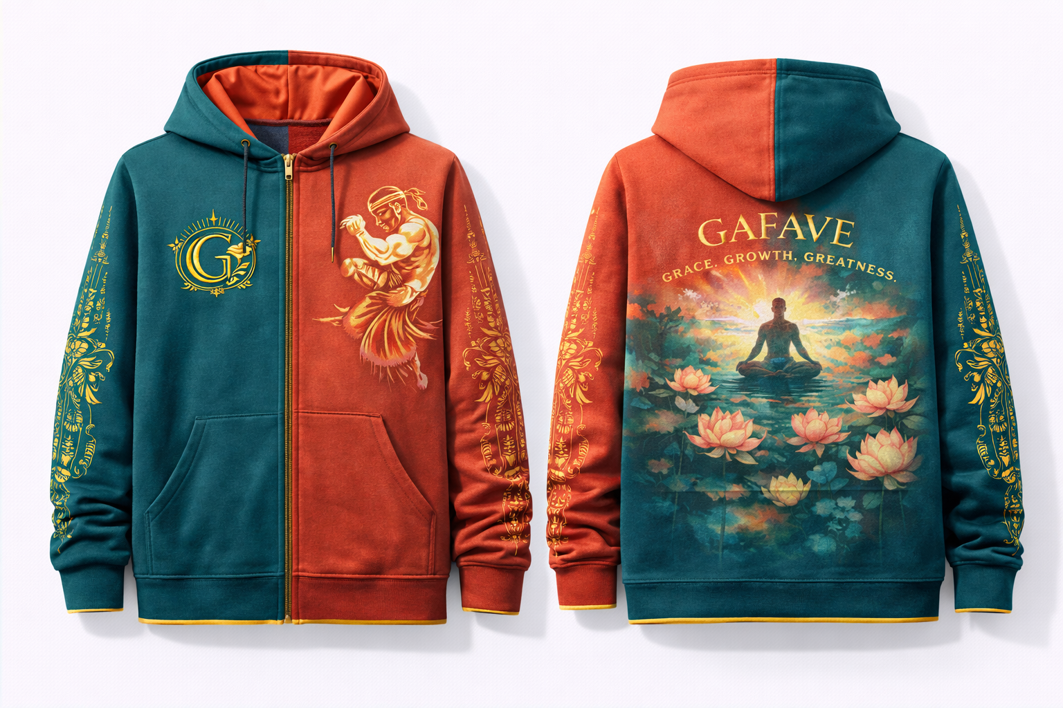 Two worlds, one garment. The Grace In Motion Zip Hoodie is a teal/coral colour-split piece featuring a Muay Thai fighter and Sak Yant script column on the coral front panel, an impressionistic Lotus Pond Meditation mural across the full back, and a gold Thai floral pattern printed down the teal left sleeve.