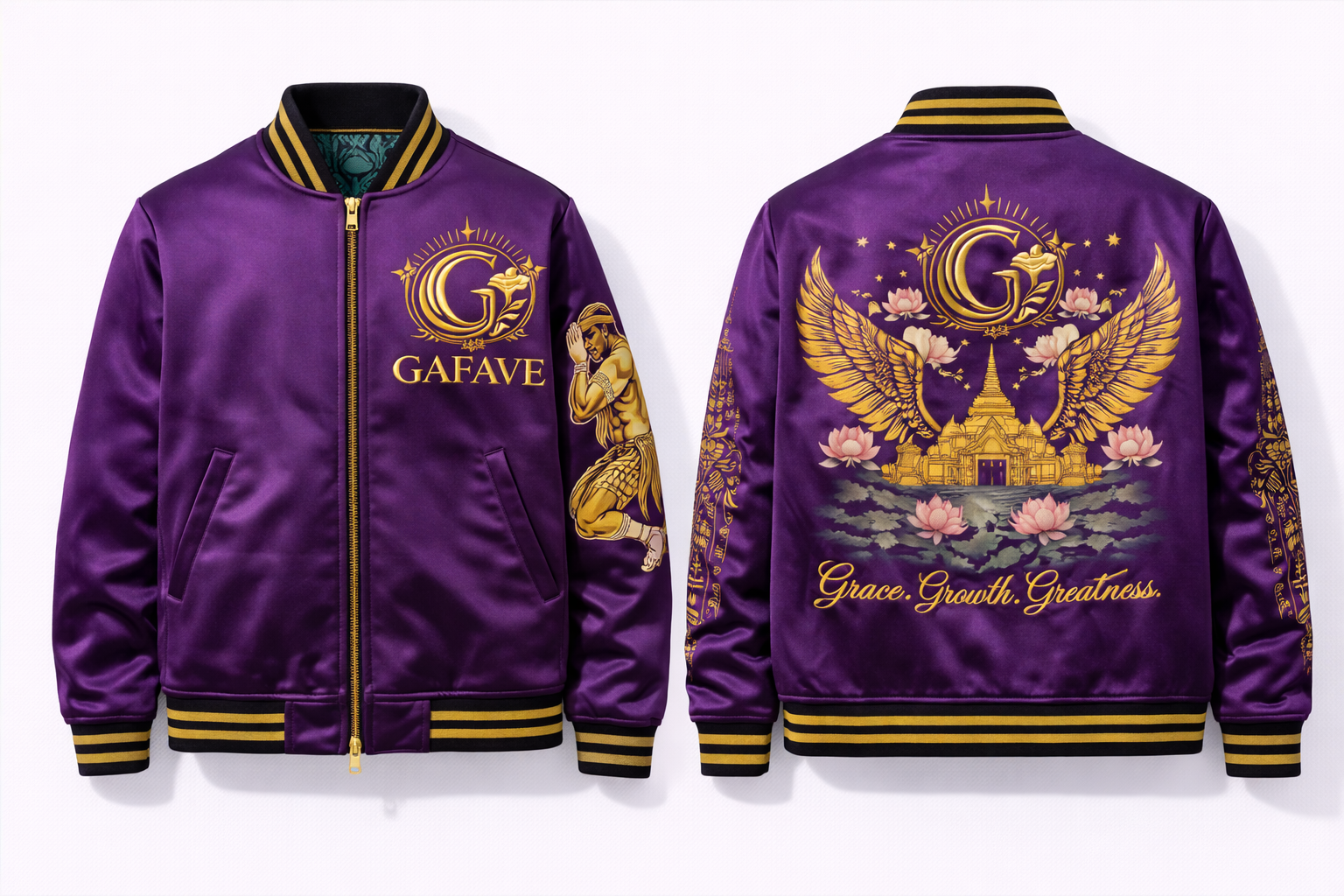 Named for one of Muay Thai’s legendary gyms. The Petchyindee Bomber features a Wai Kru fighter embroidery on the right chest, a Temple + Garuda Wings + Lotus Scene across the full back in gold embroidery, Sak Yant sacred script columns down both sleeves, and a teal Art Deco Thai interior lining.
