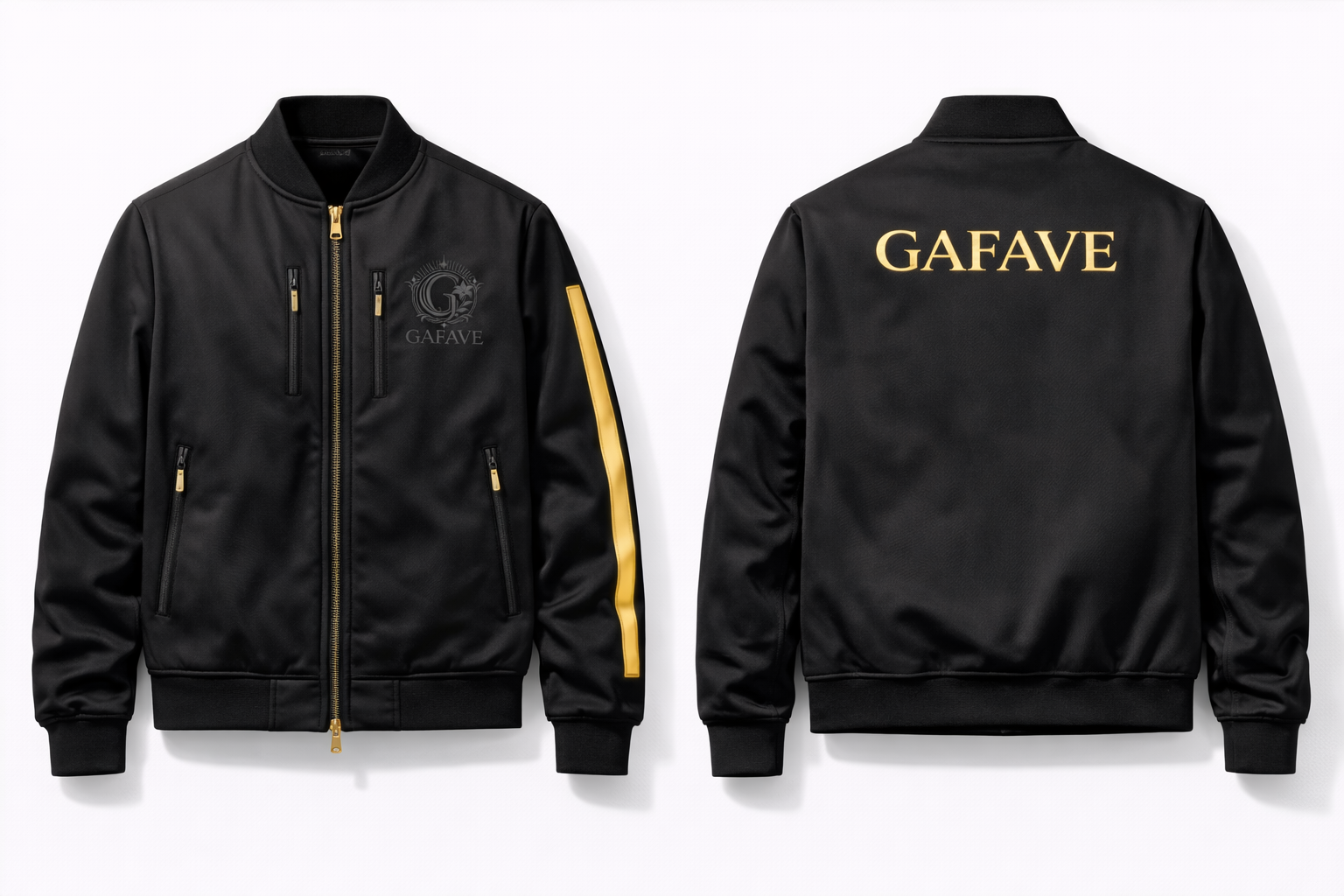 The quietest flex in the room. The Stealth GFV Bomber features a tonal gunmetal rubber patch at the chest — nearly invisible at distance — a 3M Scotchlite gold reflective GAFAVE wordmark across the back, and a full-length reflective gold stripe down the left sleeve. Invisible by day. Blazing by night.