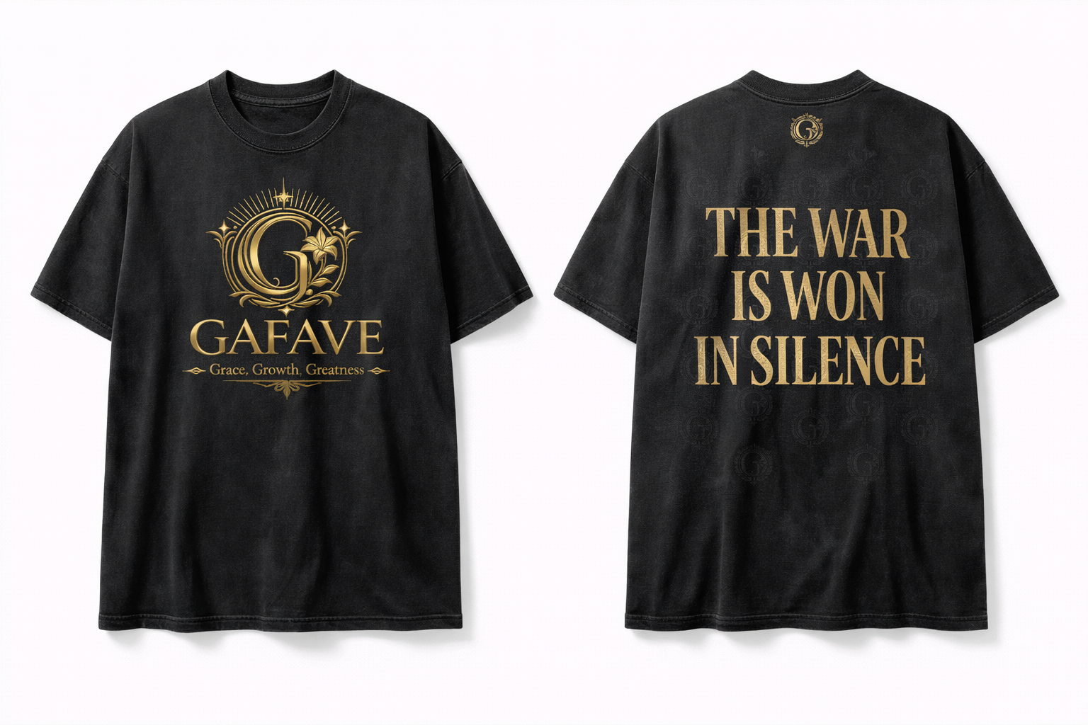Built for the silent grinder. The War Is Won Tee features a full GAFAVE logo stack in 3D gold foil on the front and a bold 3-line gold foil statement — THE WAR IS WON IN SILENCE — across the back, set on a premium enzyme-washed fabric with a subtle G-Crest watermark pattern.