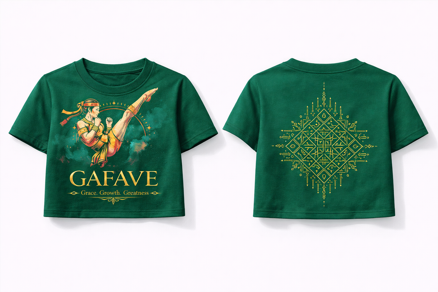 For the warrior in every woman. The Warrior Goddess Crop Tee is printed with a vibrant female Muay Thai fighter illustration in saffron and coral tones on emerald green, with the GAFAVE logo below — and a sacred Sak Yant Diamond Yantra in gold foil centered across the full back.